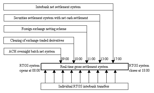 Implications of interrelationship. Of the possible consequences of the system linkages described above, the resulting liquidity interdependence between an RTGS system and other payment and settlement systems is likely to be particularly important. On the one hand, linkages between an RTGS system and other systems could improve the intraday distribution of liquidity across payment systems because RTGS can allow banks to use final funds during the day for the purpose of settlement in other systems and more intraday payment flows between participants could thus occur. On the other hand, as noted in Section II.2, if an RTGS system is involved in the settlement processes of other payment and settlement systems, "exogenous" settlement pressures would be generated by the linked system on the settlement process in the RTGS system (and vice versa). This could affect intraday liquidity requirements at the level of both individual banks and the system in the RTGS system.